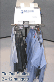 The TIE-OUT Station is capable of tying 2-12 hangers without having to remove, lift or otherwise strain your operators. This specialized machine for the uniform industry speeds up your operation. Click on the links below for more info in pdf files.